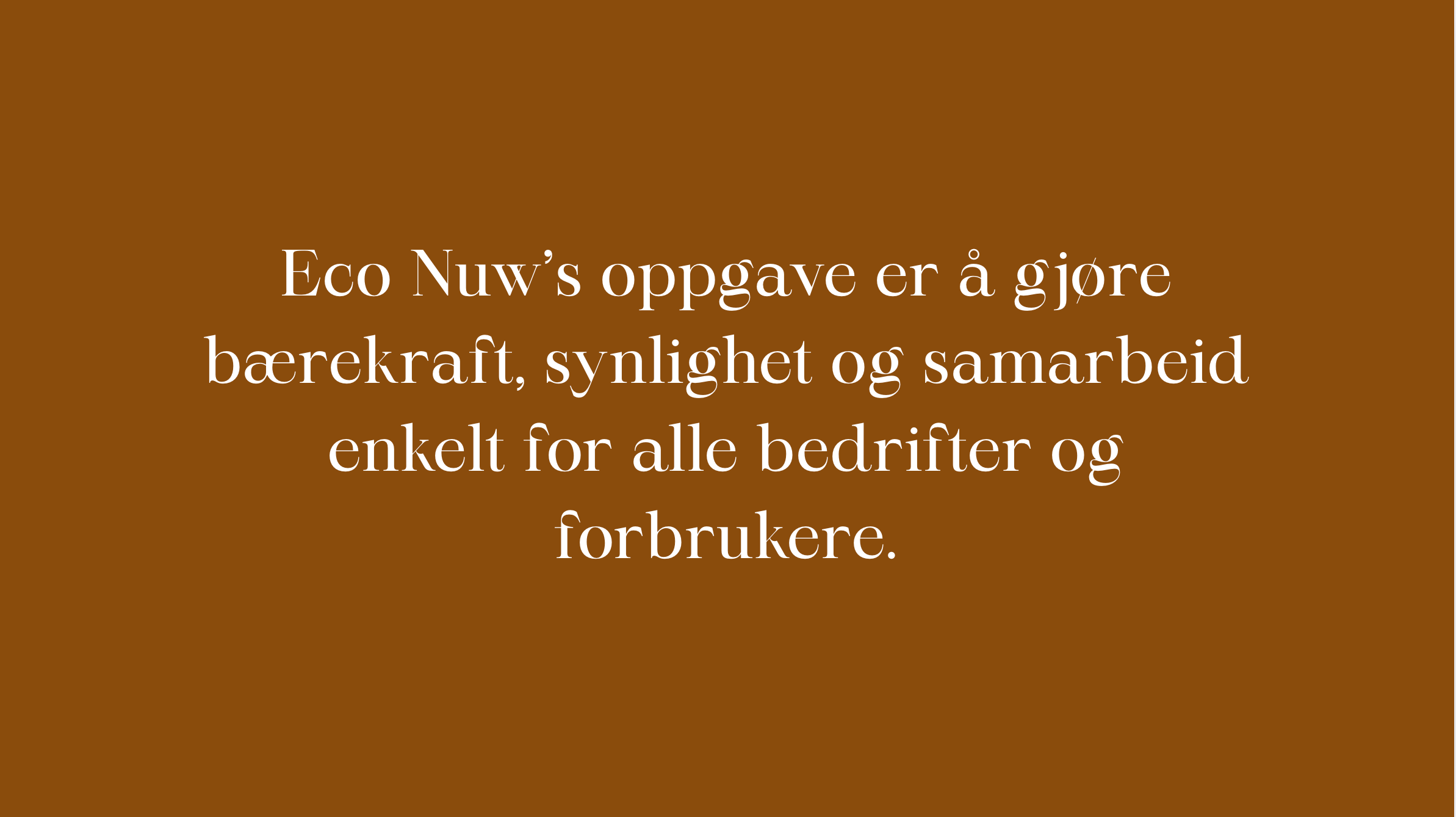 Eco Nuw sitt mål er å nå mennesker over hele landet, både forbrukere og bedrifter. I 2025 har vi utviklet en plattform som allerede rommer over 1000 produkter fra norske produsenter og leverandører. Samtidig jobber Eco Nuw strategisk med å nå ut til norsk næringsliv, og fremme bruken av norske og miljøvennlige produkter i bedrifter. Målet vårt er å skape et økosystem rundt norske produsenter og leverandører som ønsker å gjøre en forskjell, og bidra til et mer bærekraftig Norge.