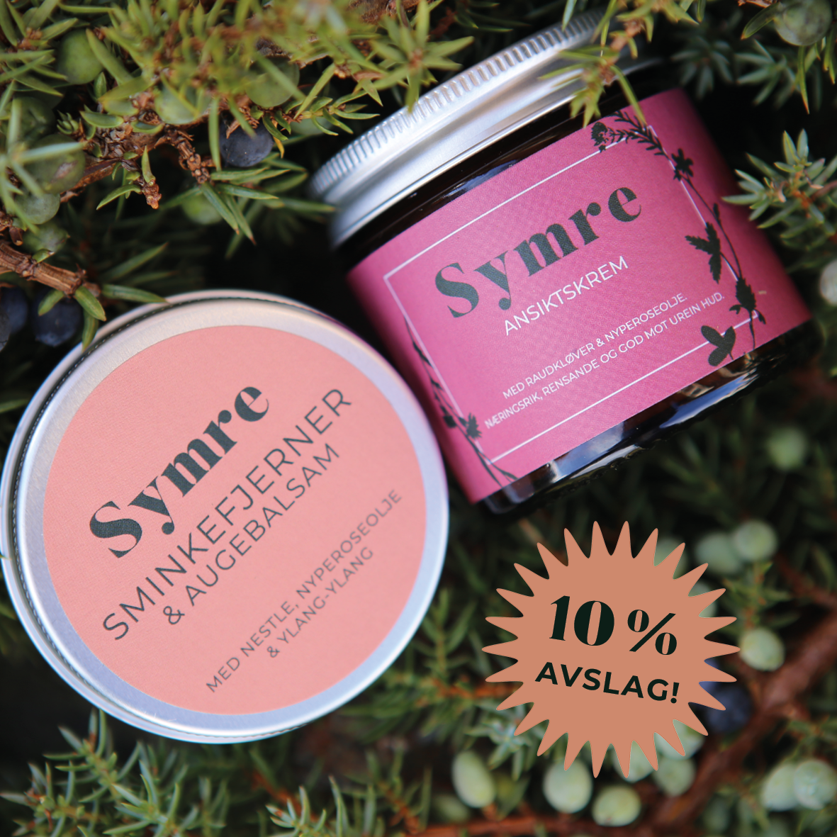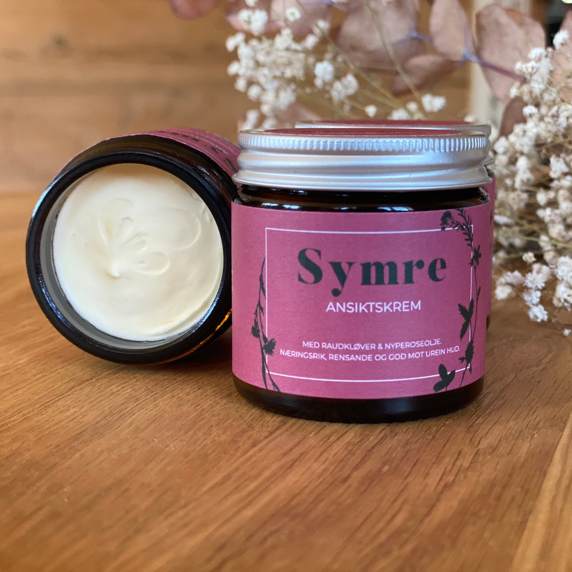 Symre ansiktskrem med raudkløver & nyperoseolje (60 ml). Dette er ein ansiktskrem som passar for alle hudtypar. Men den er særskilt god mot urein hud og for hud med aldringsteikn. Kremen er mjukgjerande og næringsrik, med talg som har eit naturleg innhald av dei feittløyselege vitaminane A, D, E, K. Kremen inneheld også villhausta raudkløver frå garden vår, som kan ha ein rensande, nærande og mjukgjerande effekt. Nyperoseolje er god mot urein hud, rik på antioksidantar og er særs god for aldrande hud. Rosegeranium er mykje brukt i hudpleie for sine eigenskapar mot urein hud, eksem, aldrande hud. Kremen har ein rik aroma av rose.