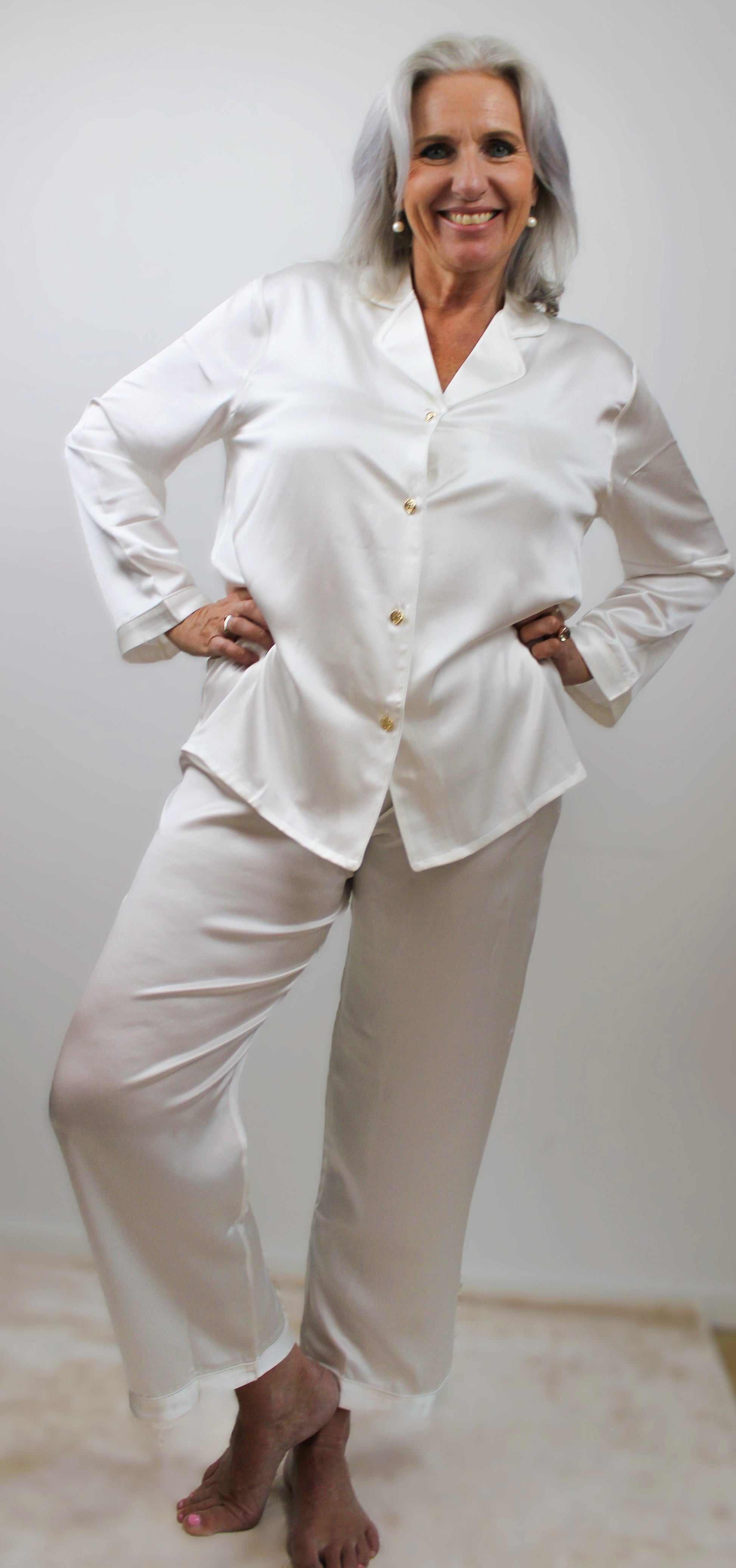 100 % ren silke i elfenbenshvit farge. Gullbelagte knapper som ser ut som sitronskiver. Tynn og avslappet strikk i livet for å skape rom for deg og din kropp.