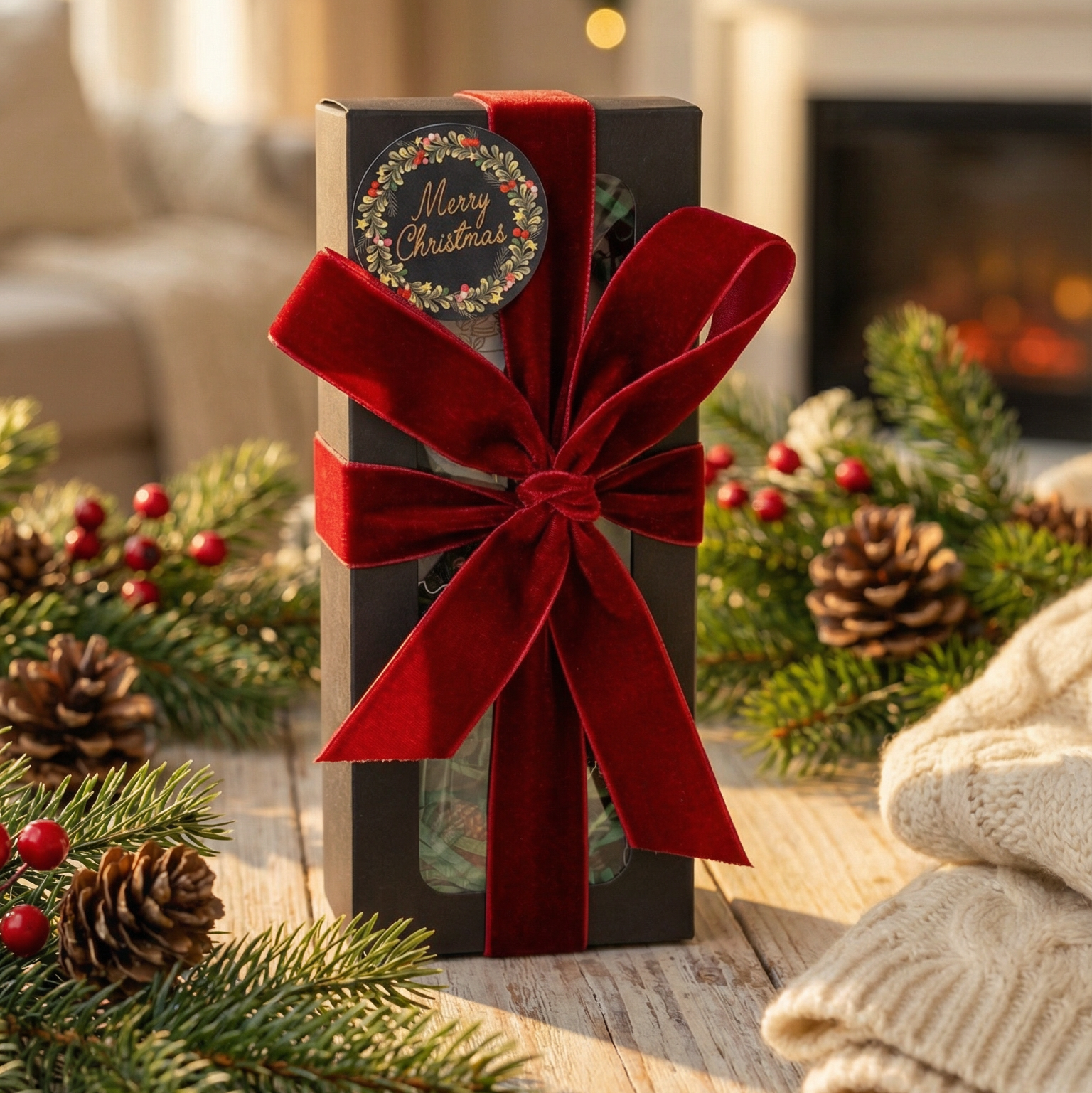 Denne pakken inneholder Talga Rich og Talga Light i 60 ml glass, elegant pakket og klar til å legges under treet. Sløyfefargen er tilfeldig (grønn eller rød).