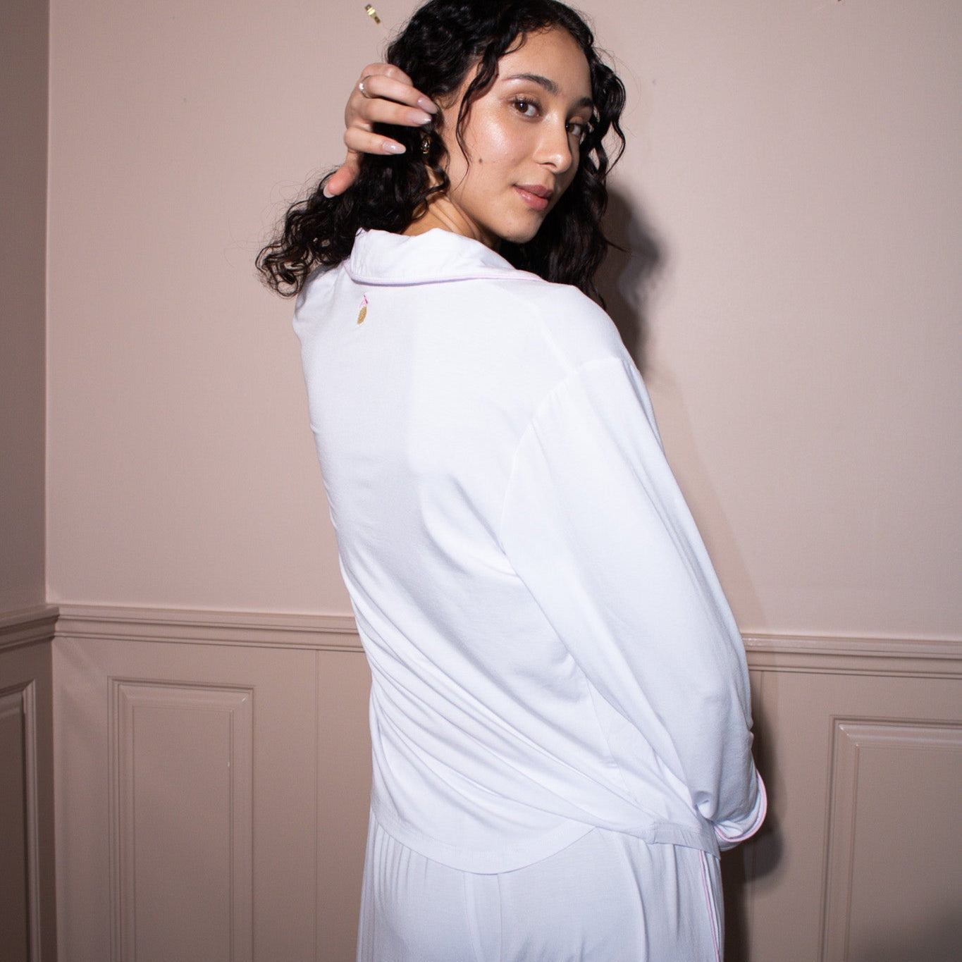 Pysjen er laget av 100 % myk bambus i hvit med rosa detaljer.