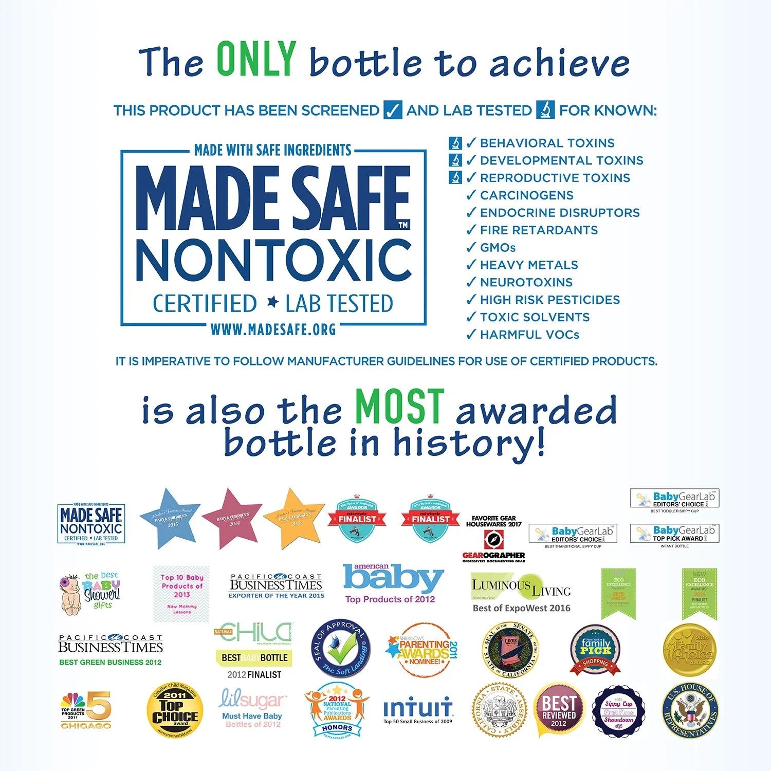 - De eneste flaskene i verden som er sertifisert av MADESAFE.org (USAs første omfattende helsesertifisering for alle kategorier av forbrukerprodukter – en non-profit organisasjon som jobber for å gjøre det enkelt for forbrukere å finne trygge produkter).