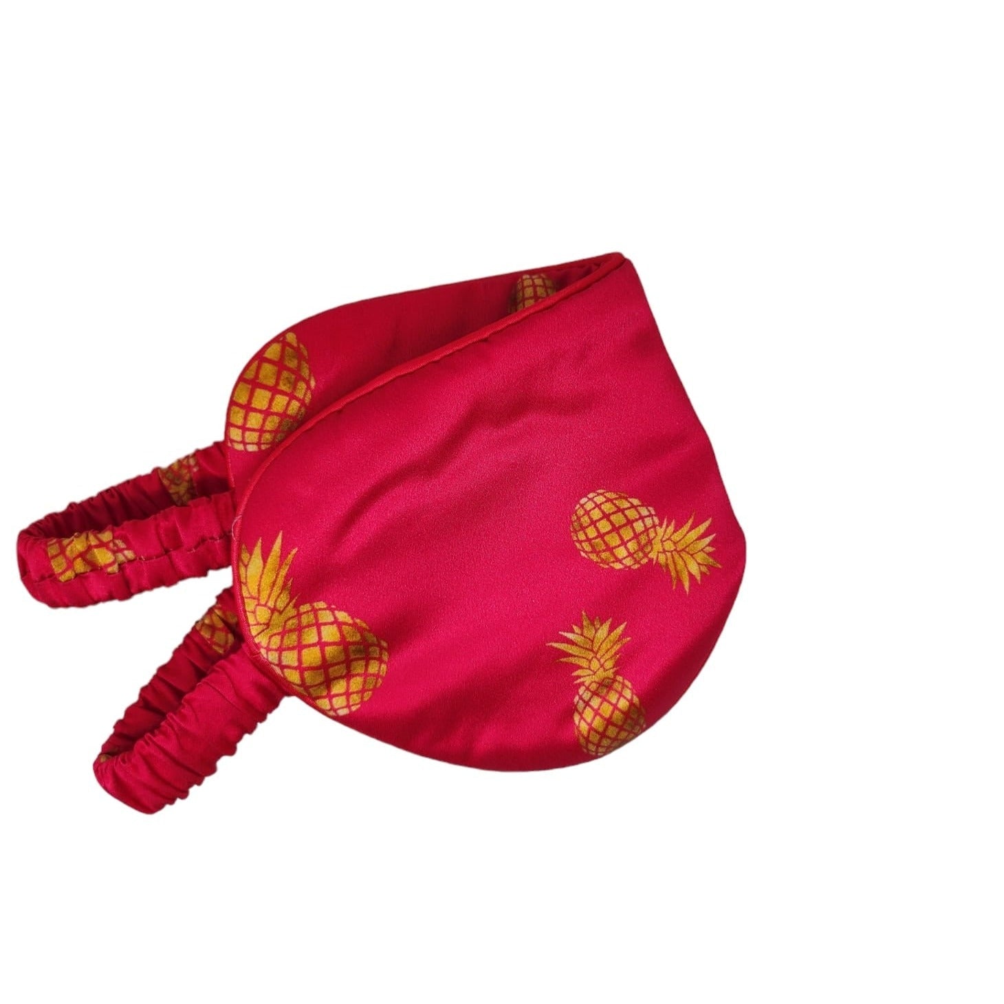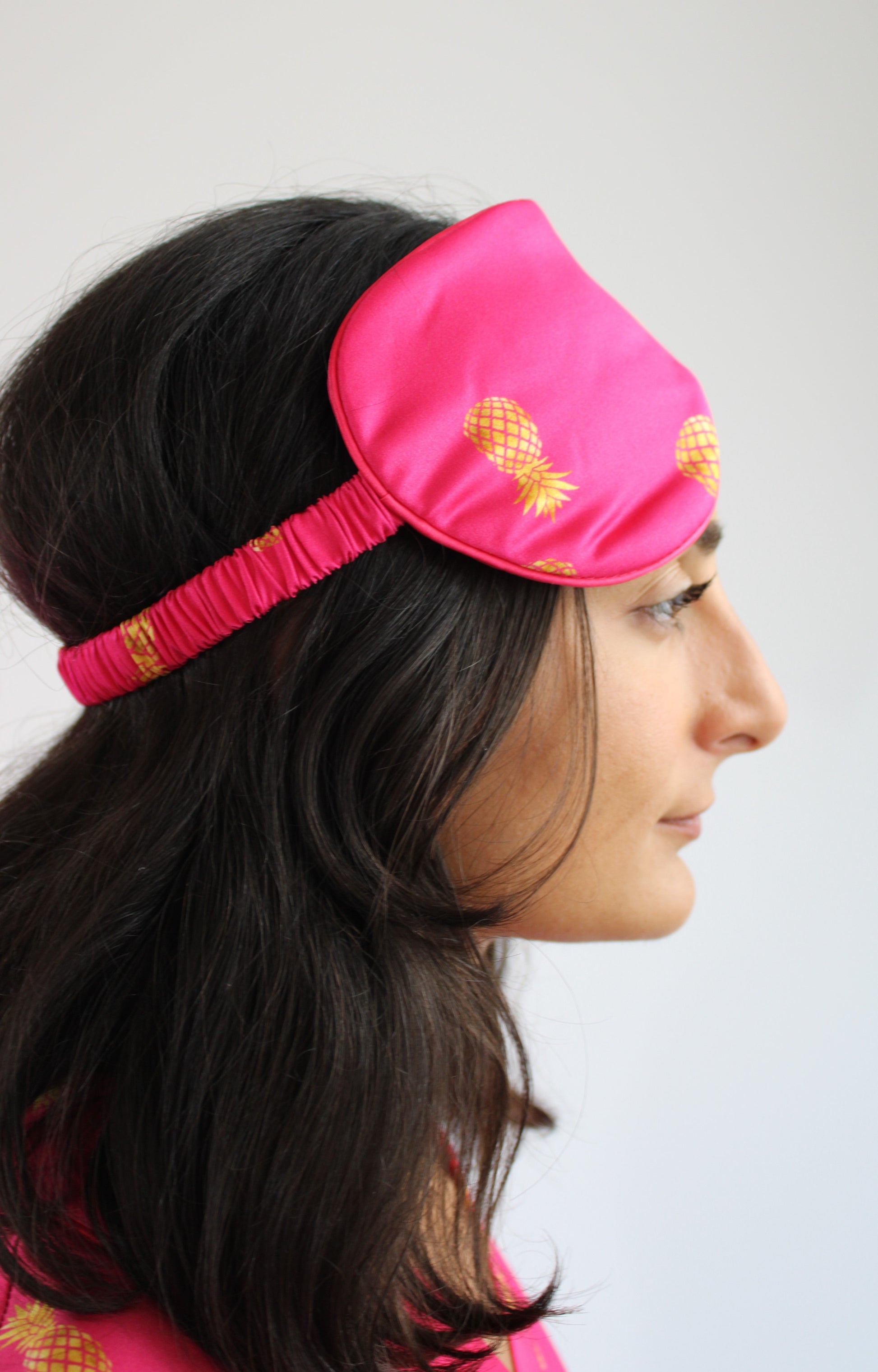 Fuchsia sovemaske med gyllne ananaser på er håndlaget, og designet for ultimat komfort. Den har et elastisk band dekket i silke, og selve øyemasken er fylt med silkestoff. Dette gjør at sovemasken er hypoallergenisk.