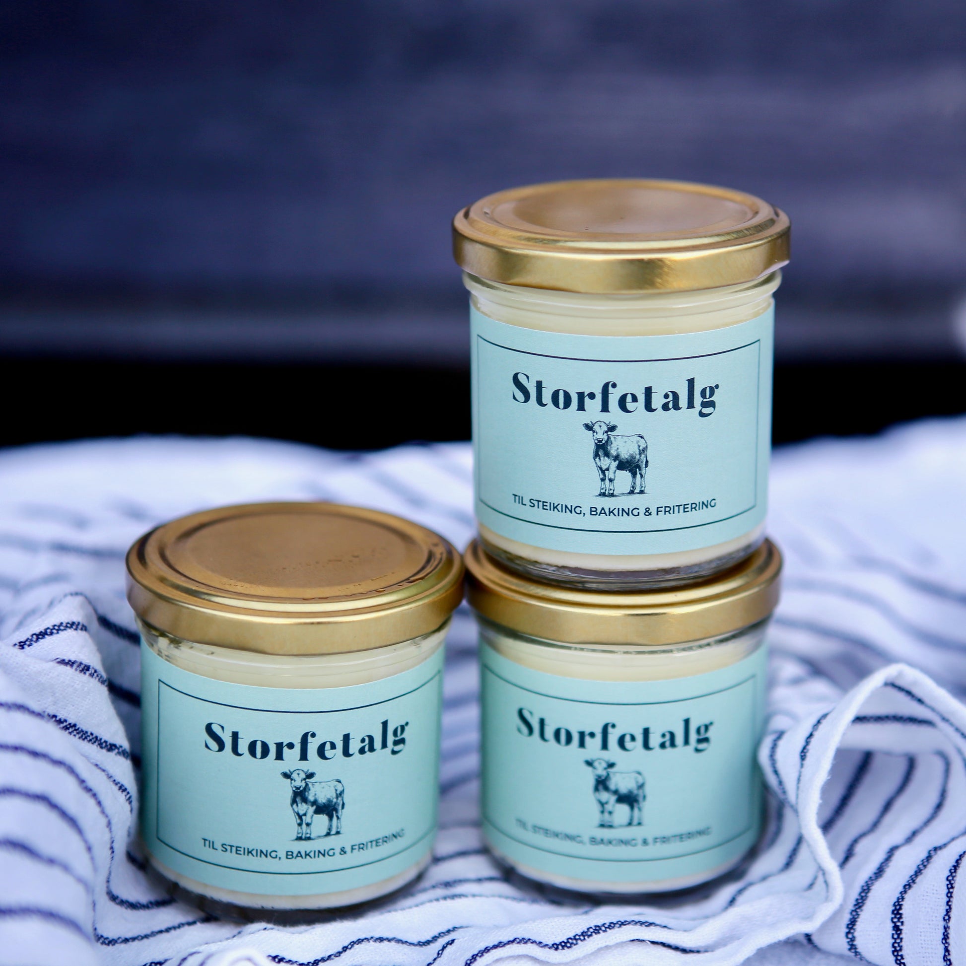 Glas med rensa talg til steiking, baking og fritering. Talget er frå våre eigne økologiske og grasfôra dyr, og frå nøye utvalde gardar i nærmiljøet vårt.