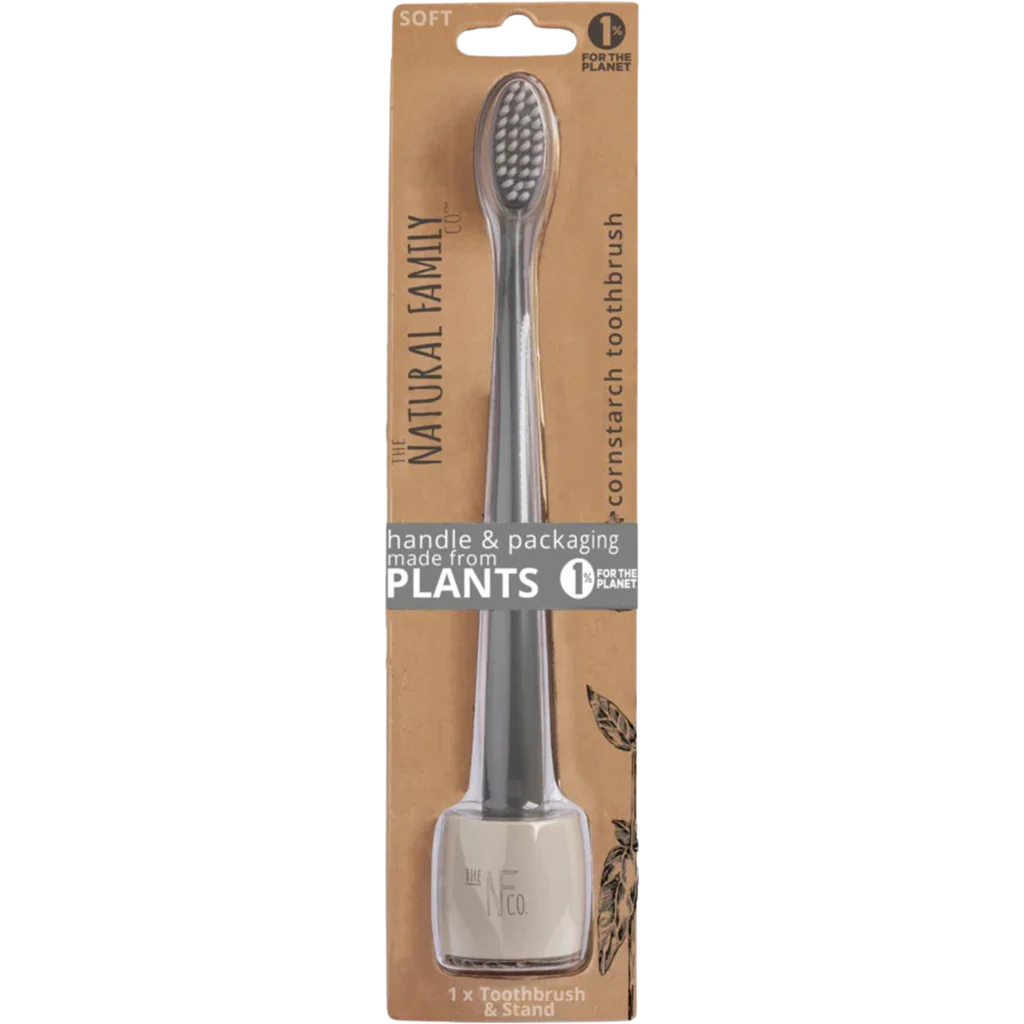 Komposterbar tannbørste med stativ fra Natural Family Co. som passer for både voksne og større barn. Laget av 100% nedbrytbar maisstivelse (uten GMO). Stativ laget av resin. Busten er laget av BPA-fri nylon.
