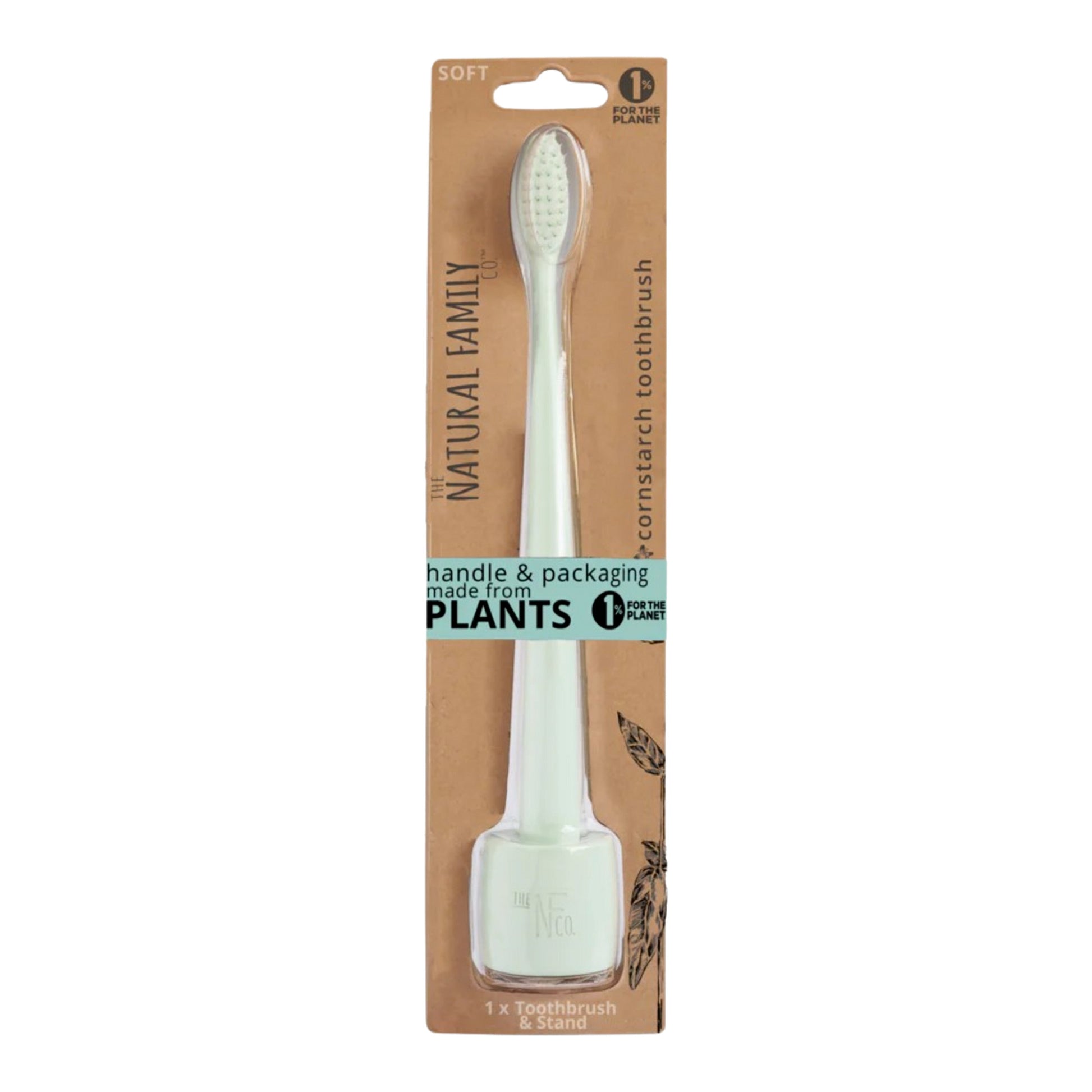 Komposterbar tannbørste med stativ fra Natural Family Co. som passer for både voksne og større barn. Laget av 100% nedbrytbar maisstivelse (uten GMO). Stativ laget av resin. Busten er laget av BPA-fri nylon.